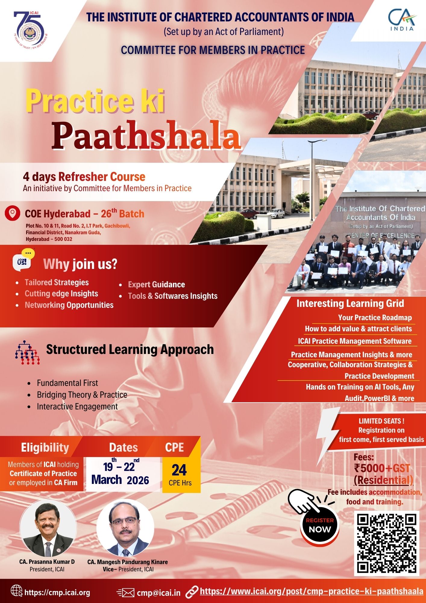 The Committee for Members in Practice of The Institute of Chartered Accountants of India is organising the 26th Batch of “Practice ki Paathshala”, a 4-Day Residential Refresher Course. The programme is designed to enhance and expand the professional practice of Chartered Accountants through focused sessions on practice management, client acquisition and value enhancement strategies, ICAI Practice Management Software, collaboration approaches, leadership development, and hands-on training in AI tools, audit tools, and Power BI. The course follows a structured learning methodology supported by expert faculty, interactive workshops, and valuable networking opportunities.