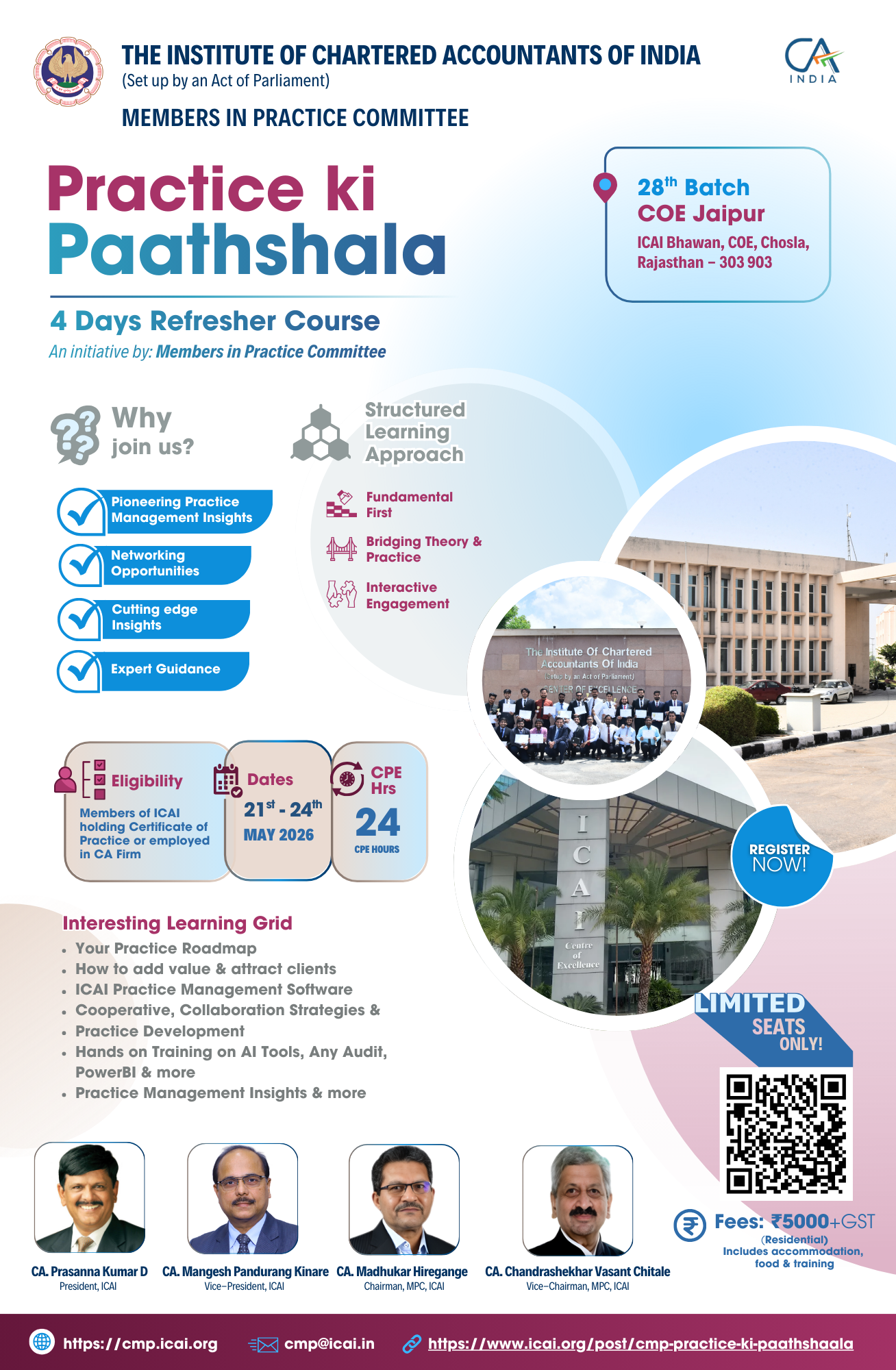 The Members in Practice Committee of The Institute of Chartered Accountants of India is organising the 28th Batch of “Practice ki Paathshala”, a 4-day residential refresher course. The programme is designed to enhance and expand the professional practice of Chartered Accountants through focused sessions on practice management, client acquisition and value enhancement strategies, ICAI Practice Management Software, collaboration approaches, leadership development, and hands-on training in AI tools, audit tools, and Power BI.