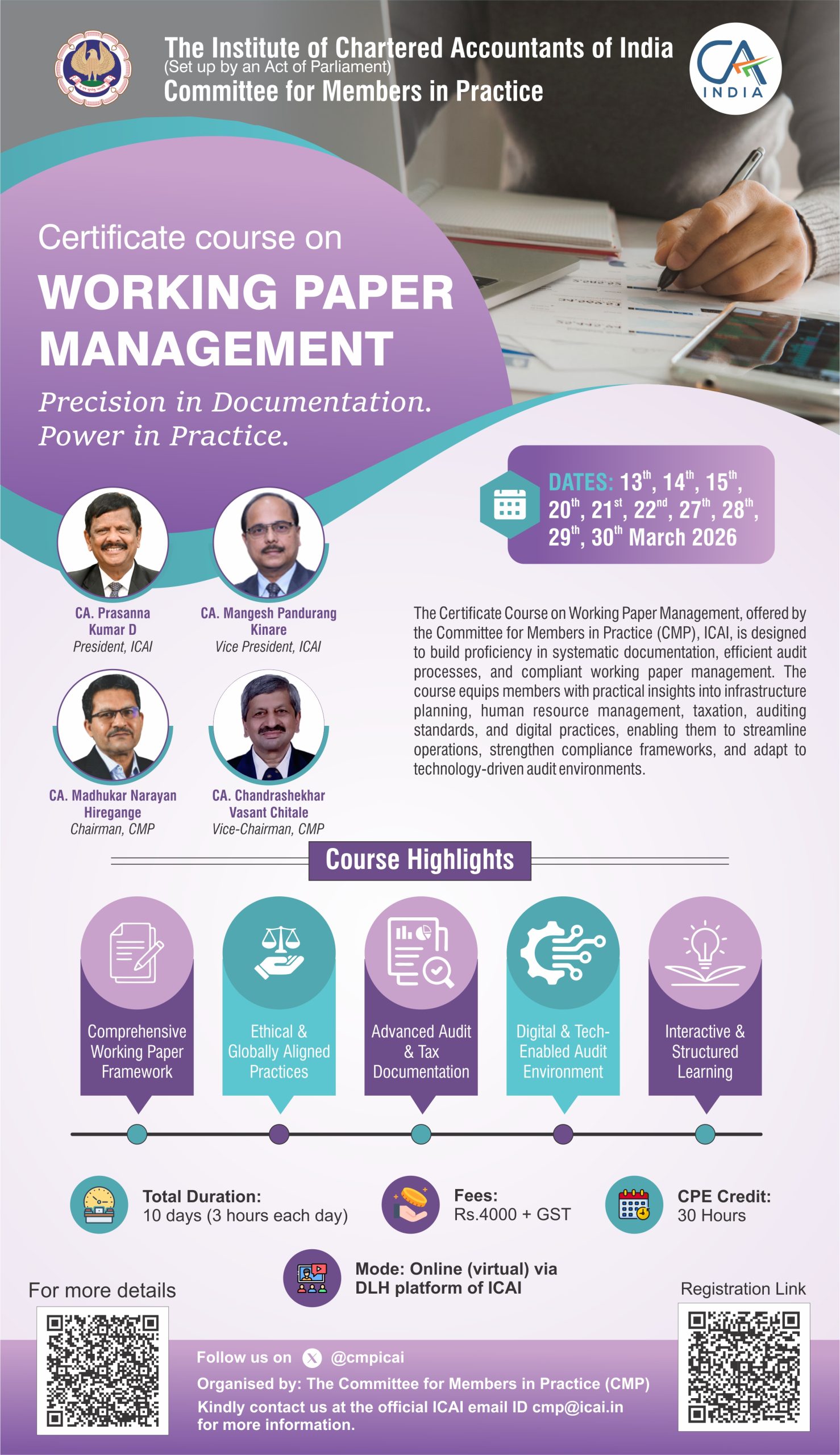 The Certificate Course on Working Paper Management, offered by the Committee for Members in Practice (CMP), ICAI, is designed to strengthen professional competence in systematic documentation, efficient audit execution, and compliant working paper management. The programme provides practical insights into audit, taxation, HR, and digital practices, enabling members to streamline operations and enhance compliance in technology-driven audit environments.