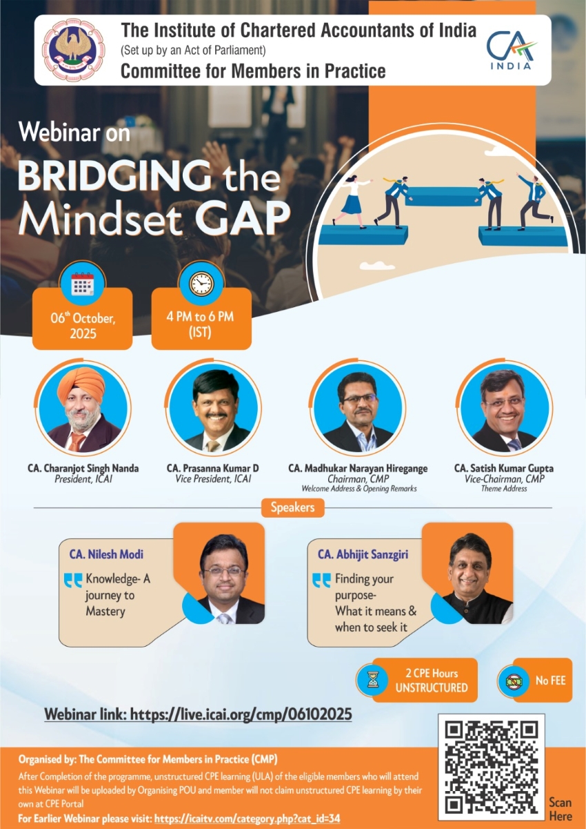 Bridging the Mindset Gap is a thought-driven webinar initiative aimed at helping Chartered Accountants move beyond technical skills by focusing on the core elements of professional success—attitude, ethics, and values. Through engaging sessions and interactive discussions with industry experts, the program provides insights on ethical decision-making, value-based leadership, and mindset development. Participants gain practical tools to embed ethics and values in their daily practice, strengthen leadership abilities, and build lasting client trust. Ultimately, the webinar empowers professionals to balance technical expertise with integrity, fostering sustainable growth and long-term professional excellence.