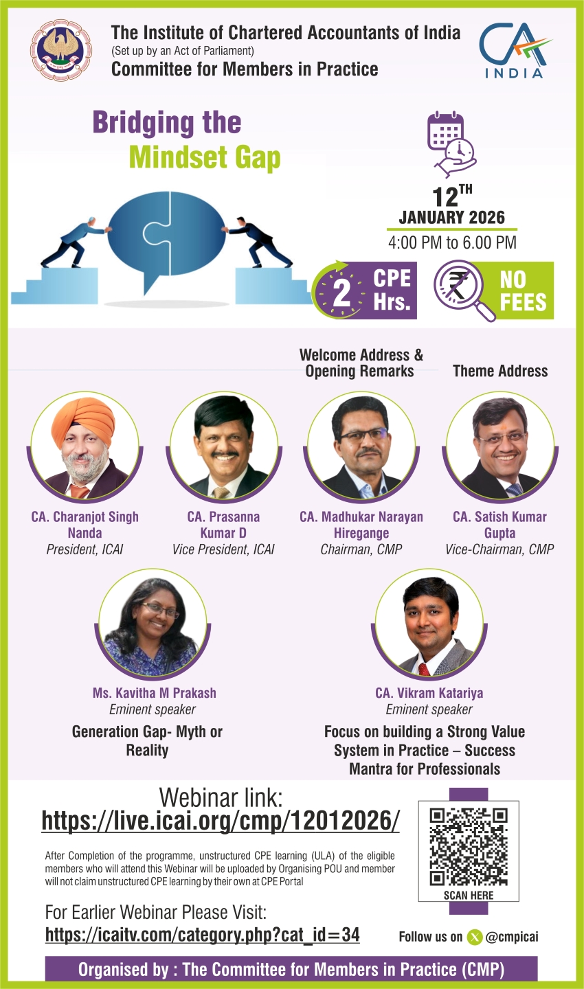 Bridging the Mindset Gap is a thought-driven webinar initiative aimed at helping Chartered Accountants move beyond technical skills by focusing on the core elements of professional success—attitude, ethics, and values. Through engaging sessions and interactive discussions with industry experts, the program provides insights on ethical decision-making, value-based leadership, and mindset development. Participants gain practical tools to embed ethics and values in their daily practice, strengthen leadership abilities, and build lasting client trust. Ultimately, the webinar empowers professionals to balance technical expertise with integrity, fostering sustainable growth and long-term professional excellence.