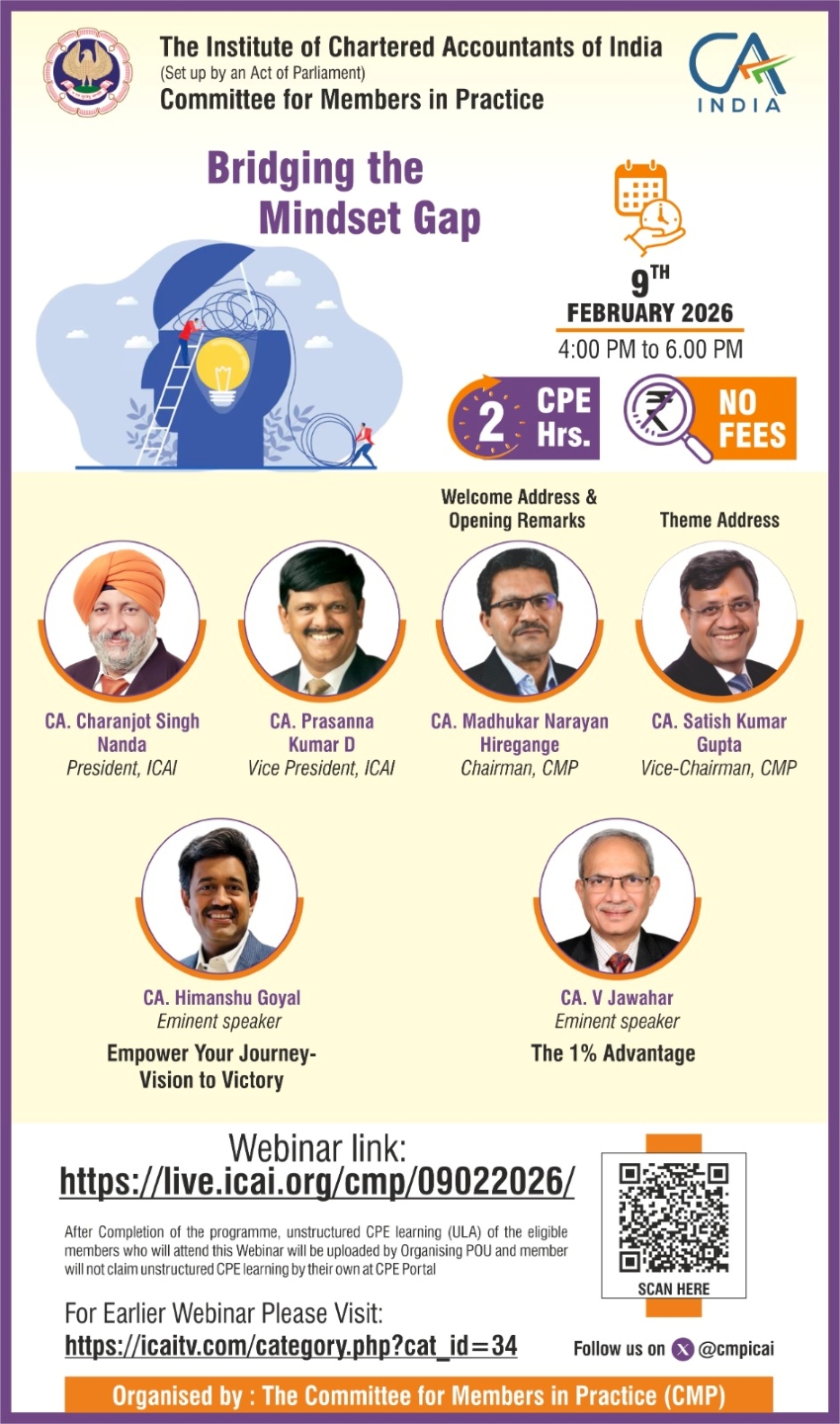 Bridging the Mindset Gap is a thought-driven webinar initiative aimed at helping Chartered Accountants move beyond technical skills by focusing on the core elements of professional success—attitude, ethics, and values. Through engaging sessions and interactive discussions with industry experts, the program provides insights on ethical decision-making, value-based leadership, and mindset development. Participants gain practical tools to embed ethics and values in their daily practice, strengthen leadership abilities, and build lasting client trust. Ultimately, the webinar empowers professionals to balance technical expertise with integrity, fostering sustainable growth and long-term professional excellence.