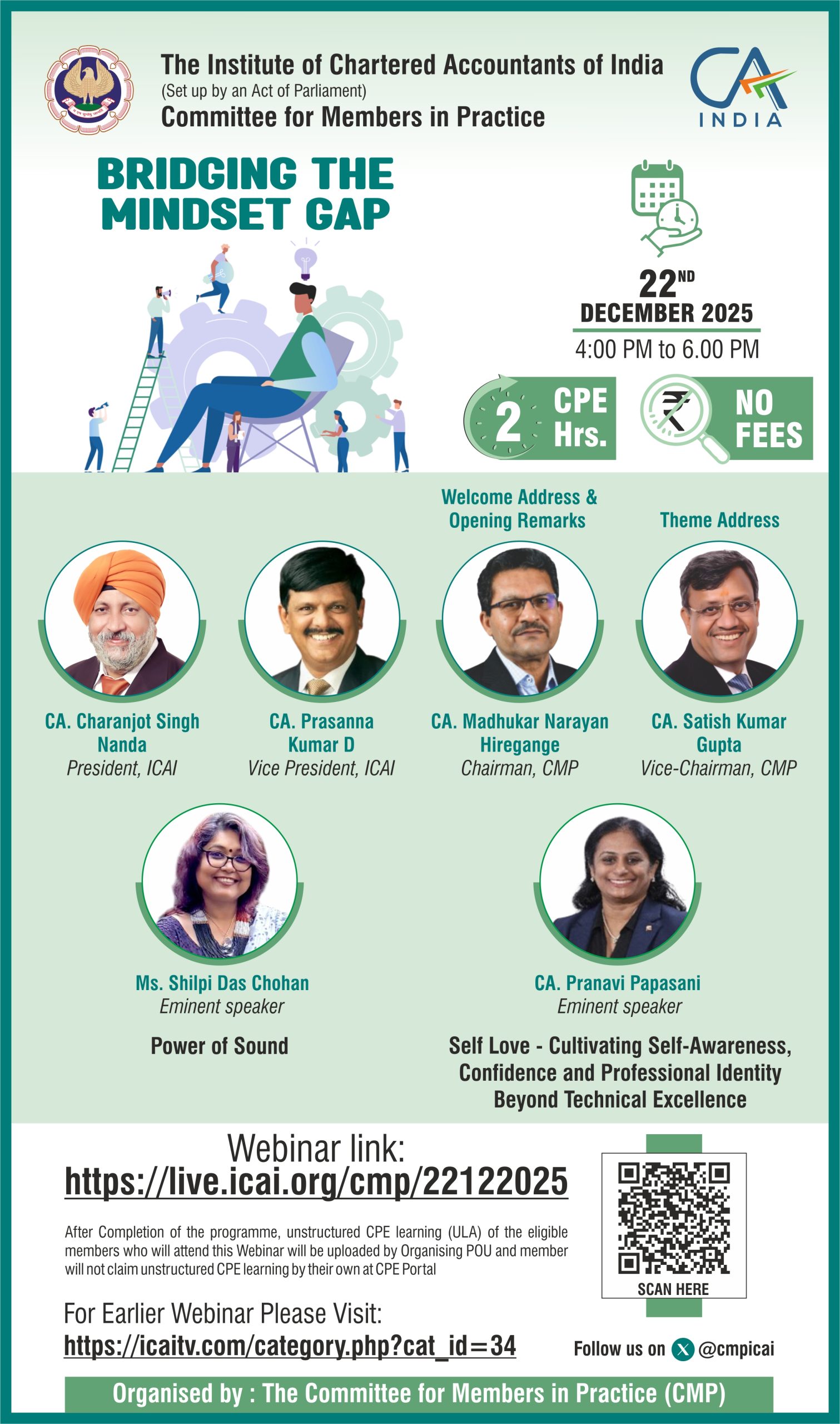 Bridging the Mindset Gap is a thought-driven webinar initiative aimed at helping Chartered Accountants move beyond technical skills by focusing on the core elements of professional success—attitude, ethics, and values. Through engaging sessions and interactive discussions with industry experts, the program provides insights on ethical decision-making, value-based leadership, and mindset development. Participants gain practical tools to embed ethics and values in their daily practice, strengthen leadership abilities, and build lasting client trust. Ultimately, the webinar empowers professionals to balance technical expertise with integrity, fostering sustainable growth and long-term professional excellence.