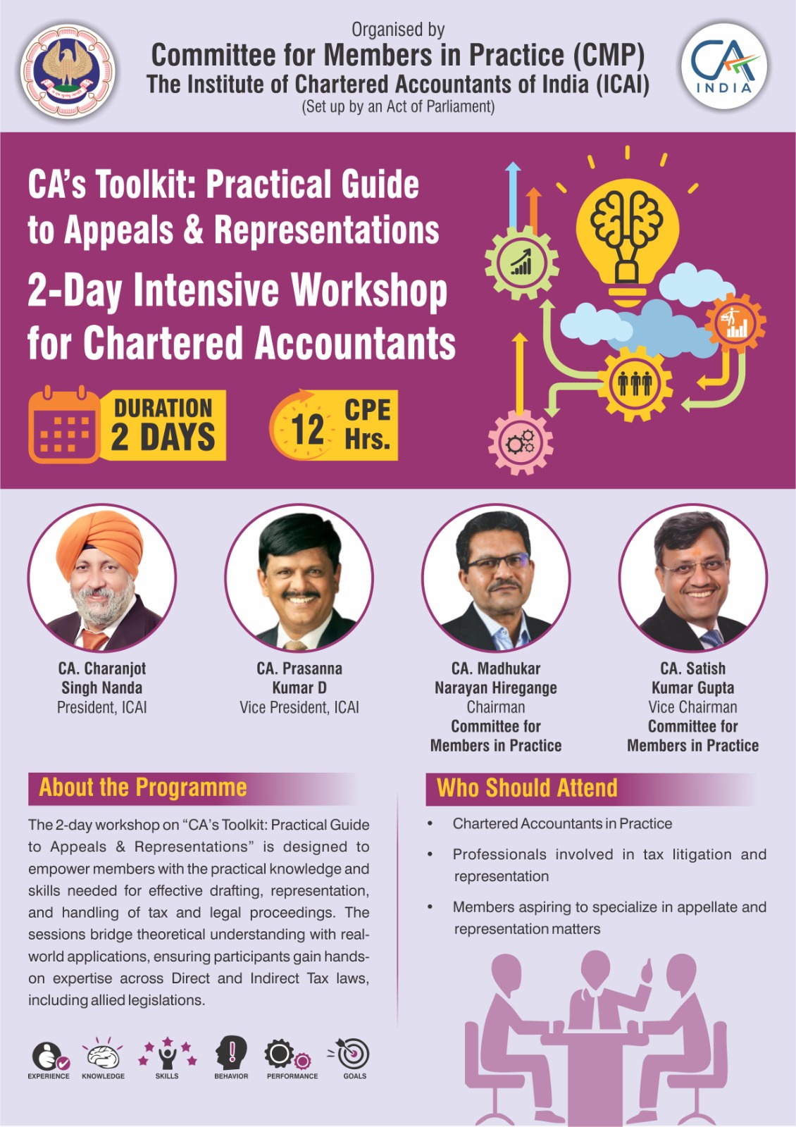 The 2-day workshop on “CA’s Toolkit: Practical Guide to Appeals & Representations” is designed to empower members with the practical knowledge and skills needed for effective drafting, representation, and handling of tax and legal proceedings. The sessions bridge theoretical understanding with real-world applications, ensuring participants gain hands-on expertise across Direct and Indirect Tax laws, including allied legislations.