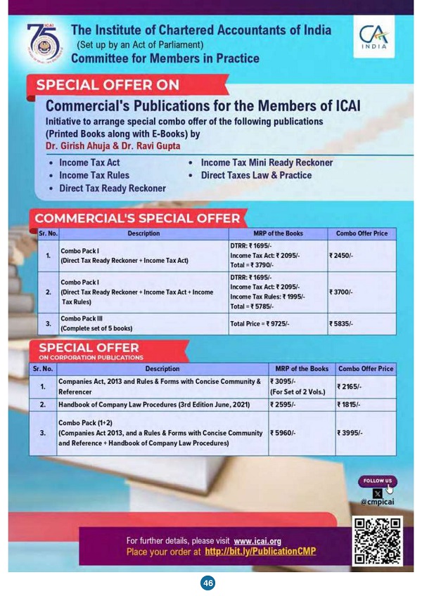 Commercial Law Publishers (India) Pvt. Ltd. offers a range of professional publications, particularly tailored for the members of ICAI. These include books on direct taxes and company law, available as printed editions bundled with e-books for enhanced digital access. The products focus on key areas like income tax compliance, direct tax reckoning and corporate procedures.