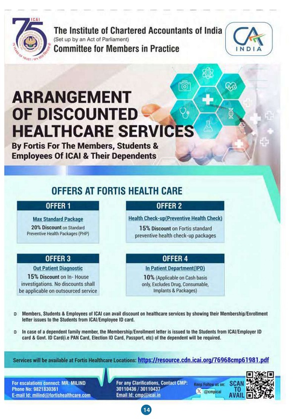 Fortis Healthcare offers a range of healthcare services including outpatient consultations, preventive health check-ups, diagnostic tests, and inpatient care. Under this arrangement, these services are available to ICAI Members and their dependents at discounted rates.