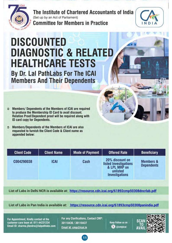 Dr. Lal Path Labs – Discounted Healthcare Services is a diagnostic benefit product for the members of ICAI and their dependents, offering preferential rates on pathology and radiology tests and home sample collection at participating Lal PathLab centres.