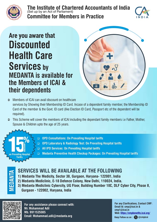 Medanta Healthcare Services provides preferential rates on consultations, diagnostics, hospitalization, pharmacy purchases, and preventive health packages at Medanta Medicity and Mediclinic centres in Gurgaon and Delhi, ensuring accessible, high-quality healthcare for members of ICAI and their dependants.