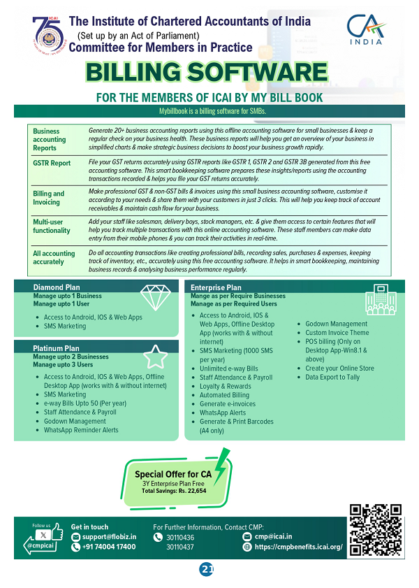 - Members may please visit https://mybillbook.in/ca-icais and login register through ICAI membership No. and can avail the discounted prices on the tool.