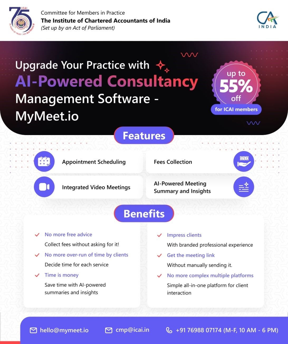- Discount: Up to 55% off on MyMeet.io plans, exclusively for ICAI members.
