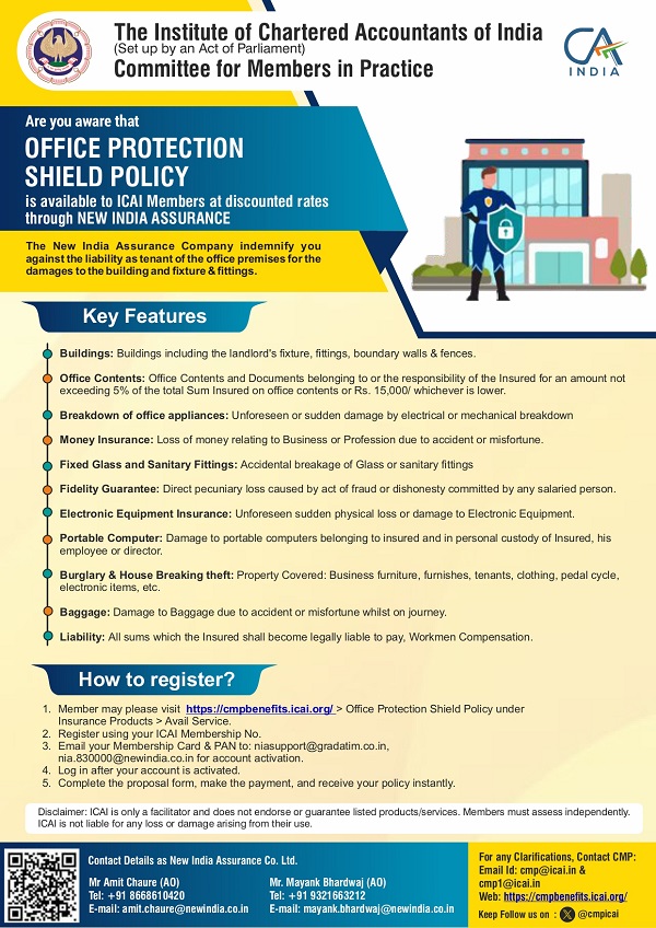 The ICAI Office Protection Shield Insurance Scheme is a specialized policy designed for members and their firms. This policy provides comprehensive coverage for office premises, including protection against fire, burglary, money in transit, and damage to electronic equipment. It aims to safeguard the professional workspace of Chartered Accountants against unforeseen events.