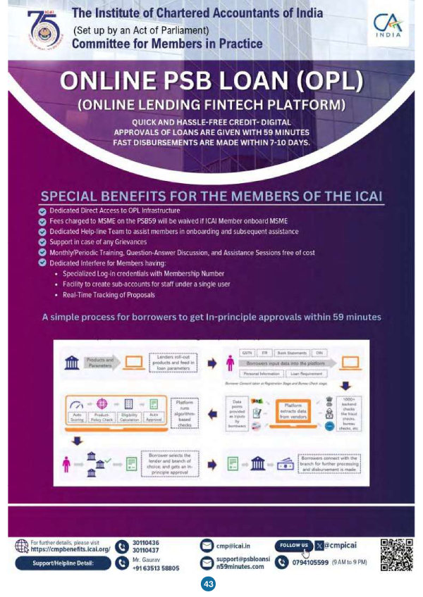 Online PSB Loan (OPL) is a digital loan facility for ICAI members, offered by Public Sector Banks. It allows members to apply online for business loans with minimal paperwork, providing fast processing, competitive interest rates, and loan amounts up to ₹1 crore. The product is designed to support ICAI members in efficiently managing their professional and business financial needs.