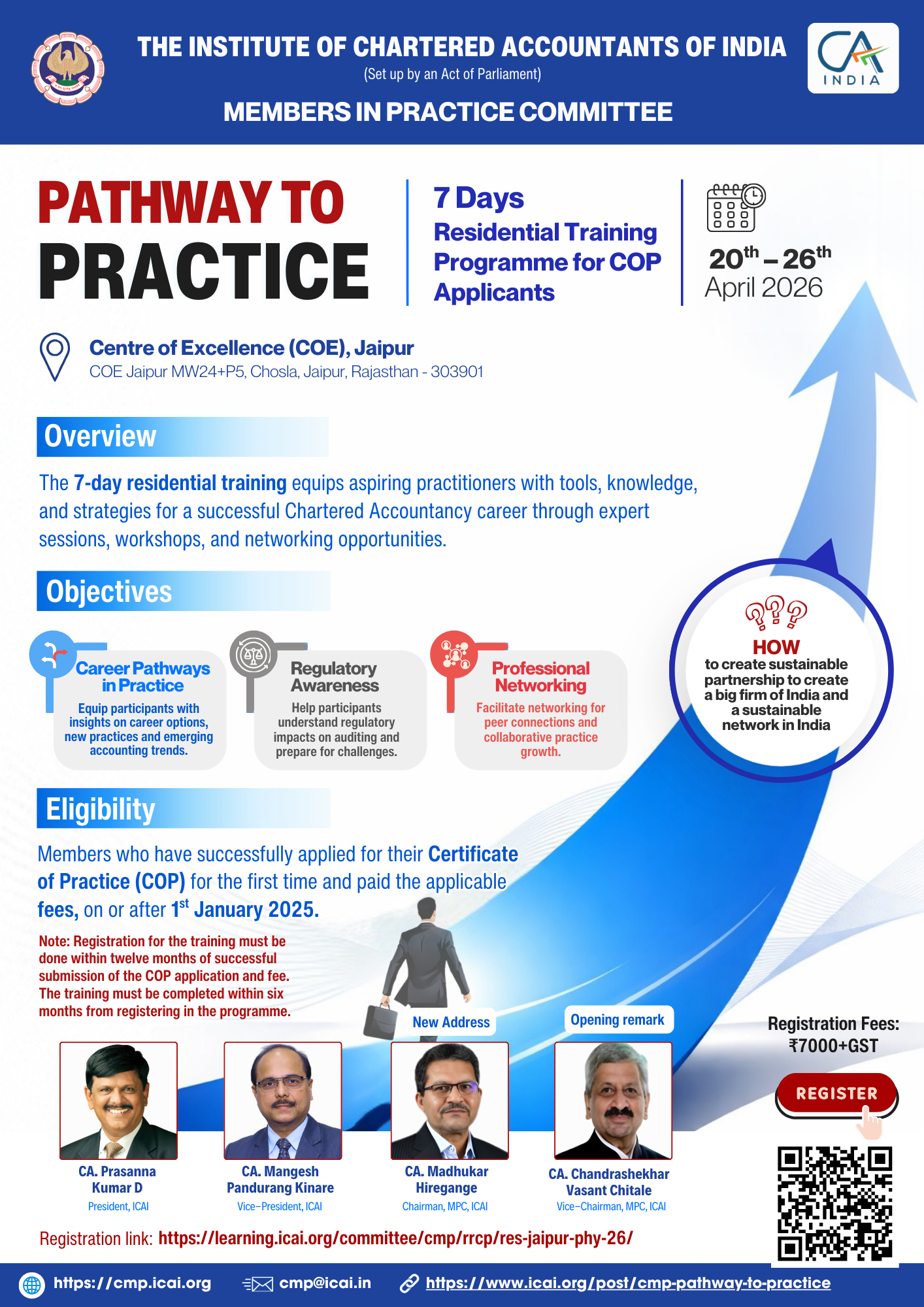 Pathway to Practice programme is a comprehensive 7-day residential training initiative by the Members in Practice Committee of the Institute of Chartered Accountants of India (ICAI), specifically tailored for first-time Certificate of Practice (COP) applicants. The programme offers an immersive learning experience through expert-led sessions, interactive workshops, and practical training. The curriculum is designed to empower participants with essential tools and strategies for managing a successful Chartered Accountancy practice. Key focus areas include practice management, regulatory compliance, client engagement, technology adoption, and adherence to ethical standards. The programme also provides invaluable opportunities for networking with peers and industry leaders while exploring diverse career pathways. Accommodation in serene and fully equipped facilities ensures a conducive environment for learning and professional growth. This initiative sets the foundation for building a future-ready practice in the dynamic field of Chartered Accountancy.