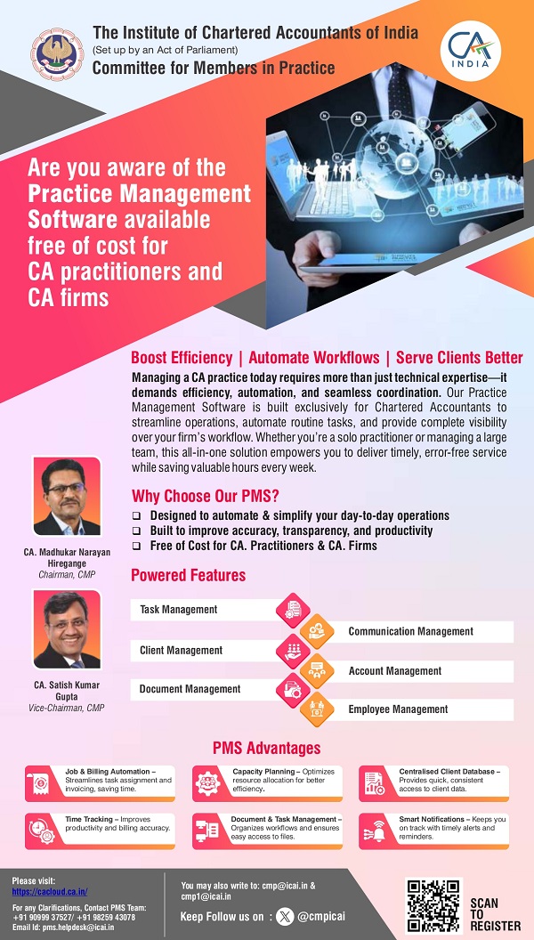 Practice Management Software (PMS) is a comprehensive cloud-based solution developed by the Institute of Chartered Accountants of India (ICAI) exclusively for CA practitioners and CA firms. Offered at free of cost, it automates daily operations, streamlines workflows, and provides full visibility into firm activities. This all-in-one tool enhances the management of tasks, clients, and teams, while boosting efficiency, accuracy, transparency, and productivity for eligible ICAI members.