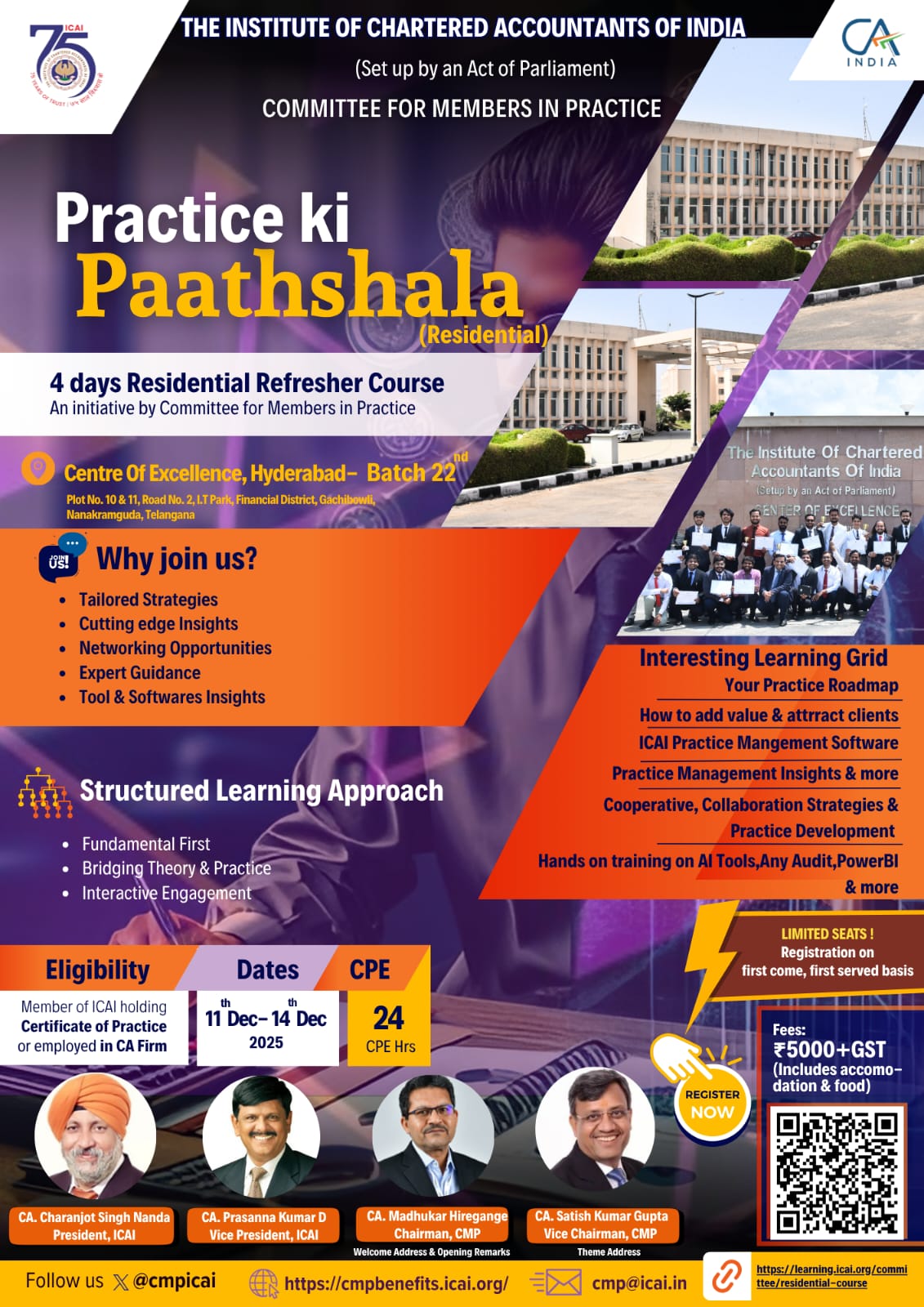 The 4 days Residential Refresher Course is being organised by the Committee for Members in Practice. The purpose is to impart key competencies vital for advancing participants’ professional practices and ensuring their continual alignment with the latest advancements in their respective fields of expertise. The course focuses on the gaining proficiency in utilizing advanced tools and technologies, gaining effective practice management, attaining personalised growth, discovering niche areas, gaining insights from experienced professionals and peers. It aims in technical expertise also fosters cross- culture appreciation and understanding of global requirements, thereby positioning them as leading professionals in the global arena.