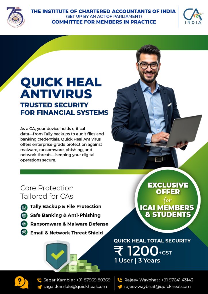 Quick Heal Total Security is an enterprise-grade antivirus software by Quick Heal Technologies Pvt Ltd, designed for members of ICAI to protect critical financial systems and data (e.g., Tally backups, audit files, banking credentials). It offers robust defense against malware, ransomware, phishing, and network-based threats, ensuring secure digital operations.