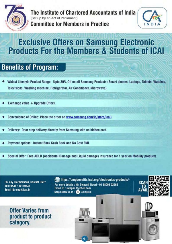 Samsung has an arrangement to offer extensive range of electronic products for the members of ICAI and students. The product lineup includes: