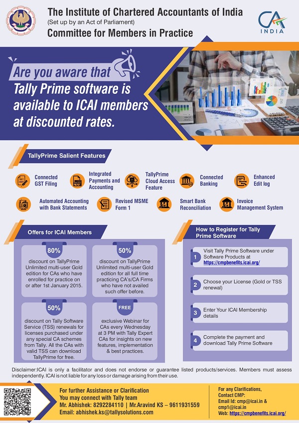- 50% discount on TallyPrime Unlimited Multi-User Gold Edition for all full-time practicing CAs/CA firms who haven't availed the offer before.