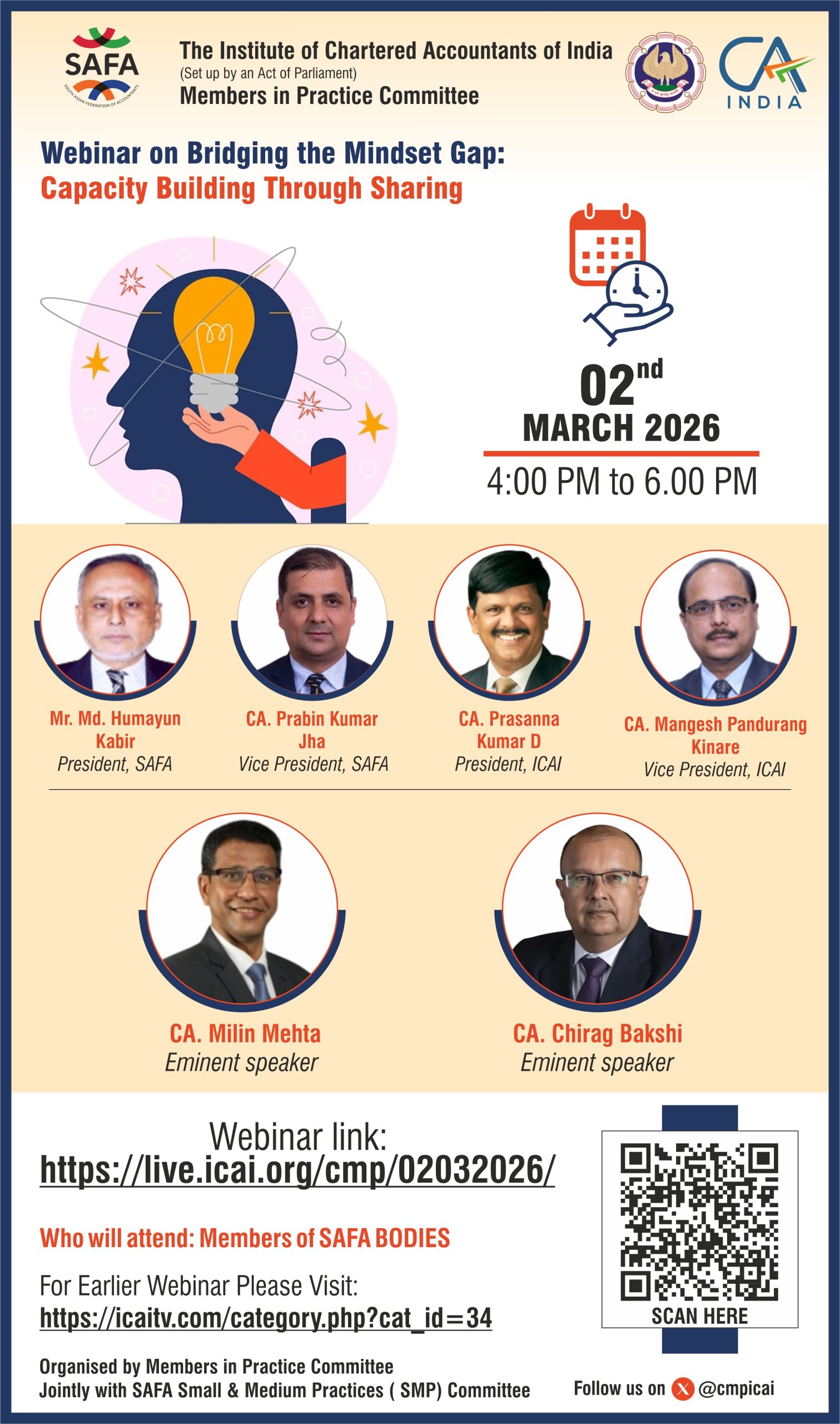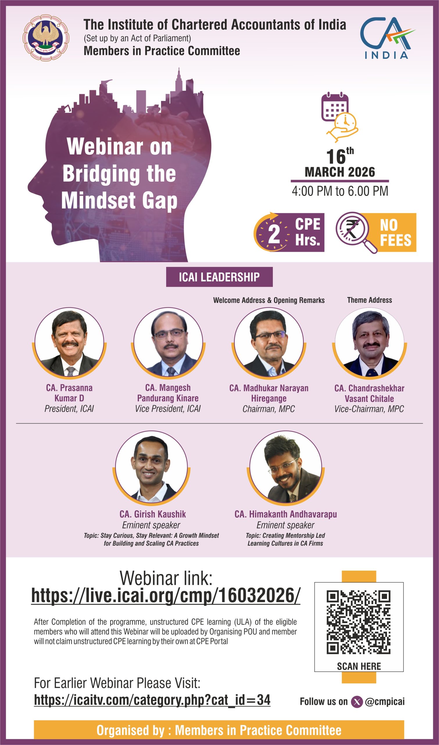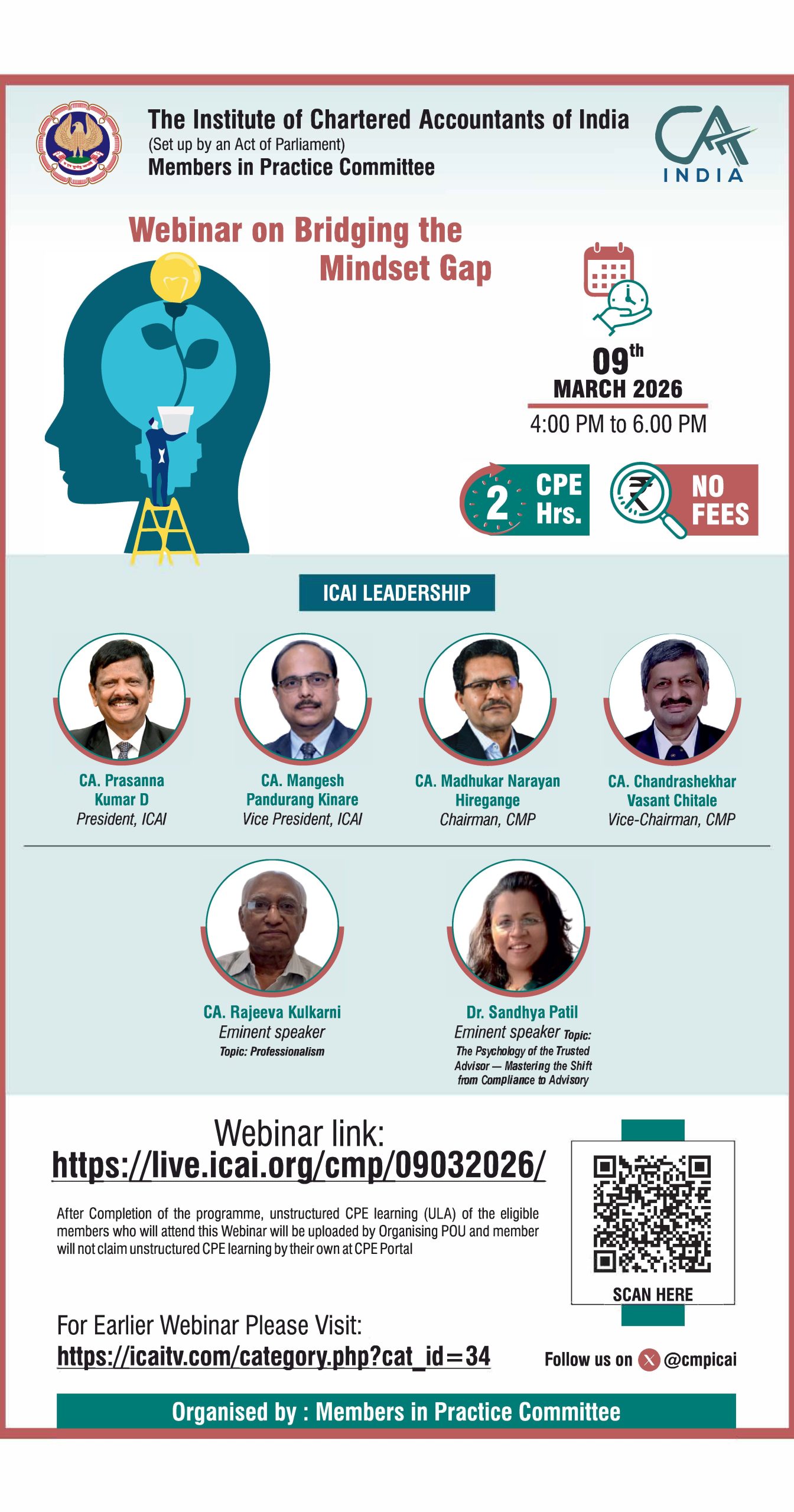 Bridging the Mindset Gap is a thought-driven webinar initiative aimed at helping Chartered Accountants move beyond technical skills by focusing on the core elements of professional success—attitude, ethics, and values. Through engaging sessions and interactive discussions with industry experts, the program provides insights on ethical decision-making, value-based leadership, and mindset development. Participants gain practical tools to embed ethics and values in their daily practice, strengthen leadership abilities, and build lasting client trust. Ultimately, the webinar empowers professionals to balance technical expertise with integrity, fostering sustainable growth and long-term professional excellence.