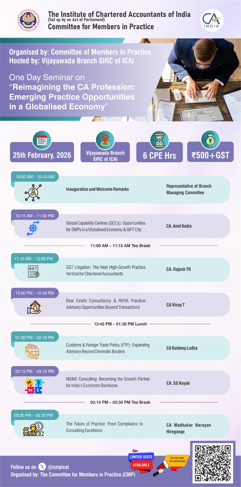 The Vijayawada Branch is organizing a one-day intensive seminar designed to help Chartered Accountants navigate the evolving global economic landscape. The program will focus on emerging practice opportunities, cross-border advisory, technology-driven services, and strategies for transforming traditional CA practices into future-ready professional enterprises.