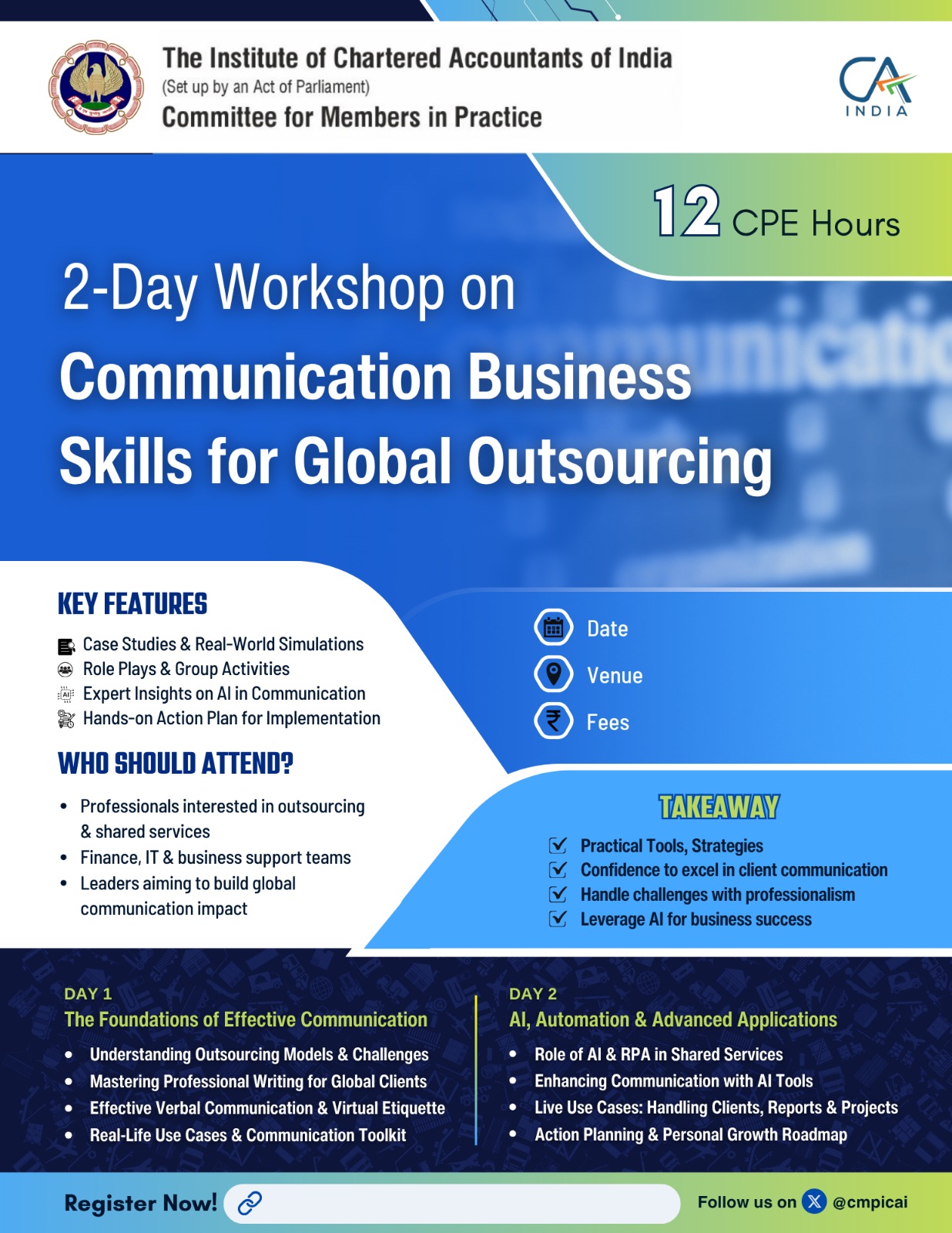 This two-day workshop is designed to enhance communication and business skills essential for Chartered Accountants and professionals engaged in global outsourcing, shared services, and client management. Through immersive sessions, real-life case studies, AI-enabled tools, and live simulations, participants will gain actionable insights and hands-on experience to thrive in global business environments.
